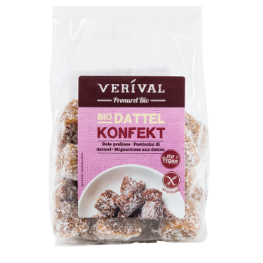 datlid* 98%, kookoshelbed*. Kontrollitud mahepõllumajandusest. Võib sisaldada pähkli, seesami ja soja jääke. Toiteväärtus 100 g kohta: energia: 1325 Kj/313 kcal; rasvad: 1,8g, millest küllastunud rasvhapped: 1,4g; süsivesikud: 68g, millest suhkrud: 62g; kiudained: 7,3g; valgud: 2,6g; sool: 0g